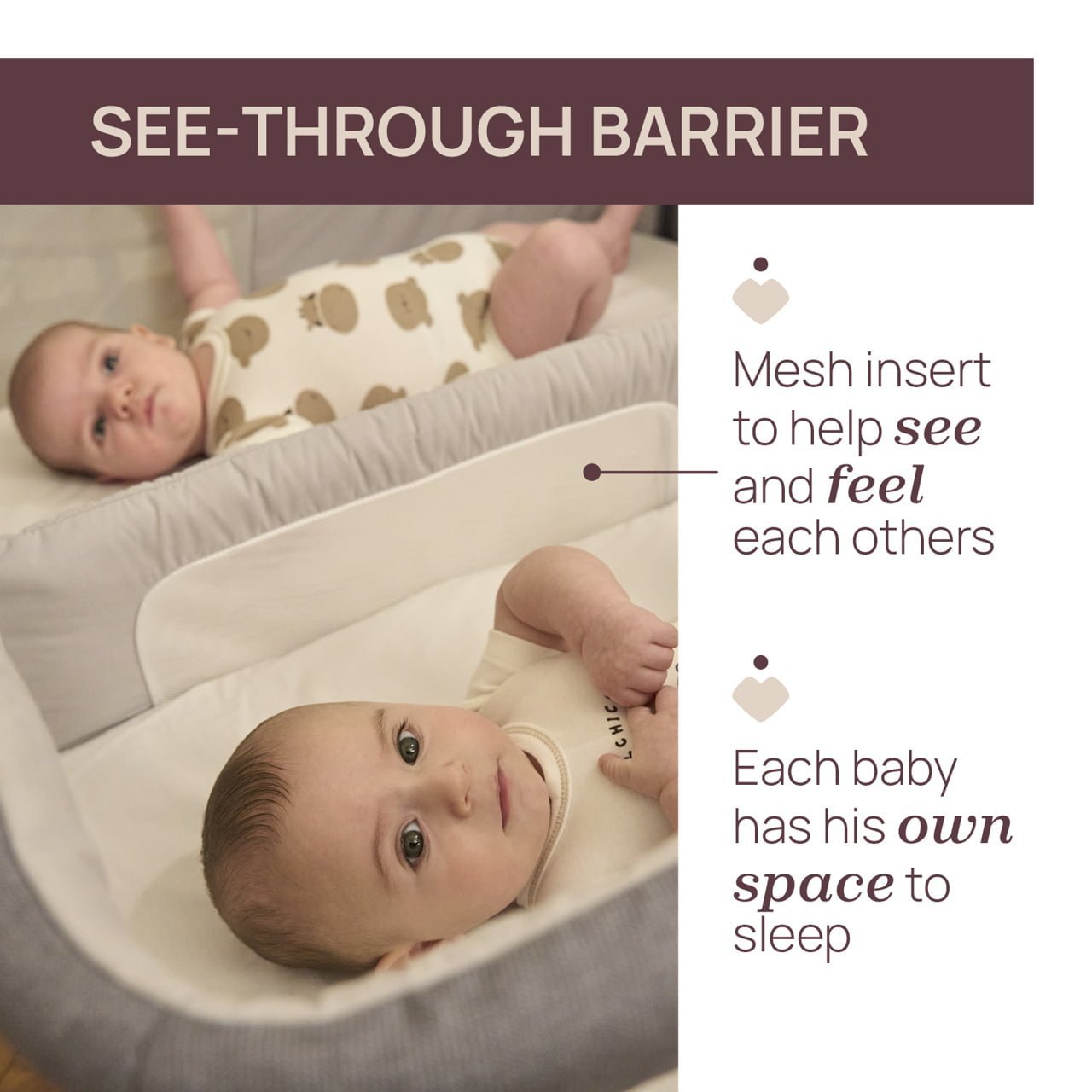 - Le berceau est Ă©quipĂ© d’une barriĂšre de sĂ©paration transparente avec un insert en maille qui permet aux jumeaux de garder un contact visuel tout en gardant leur propre espace pour dormir.